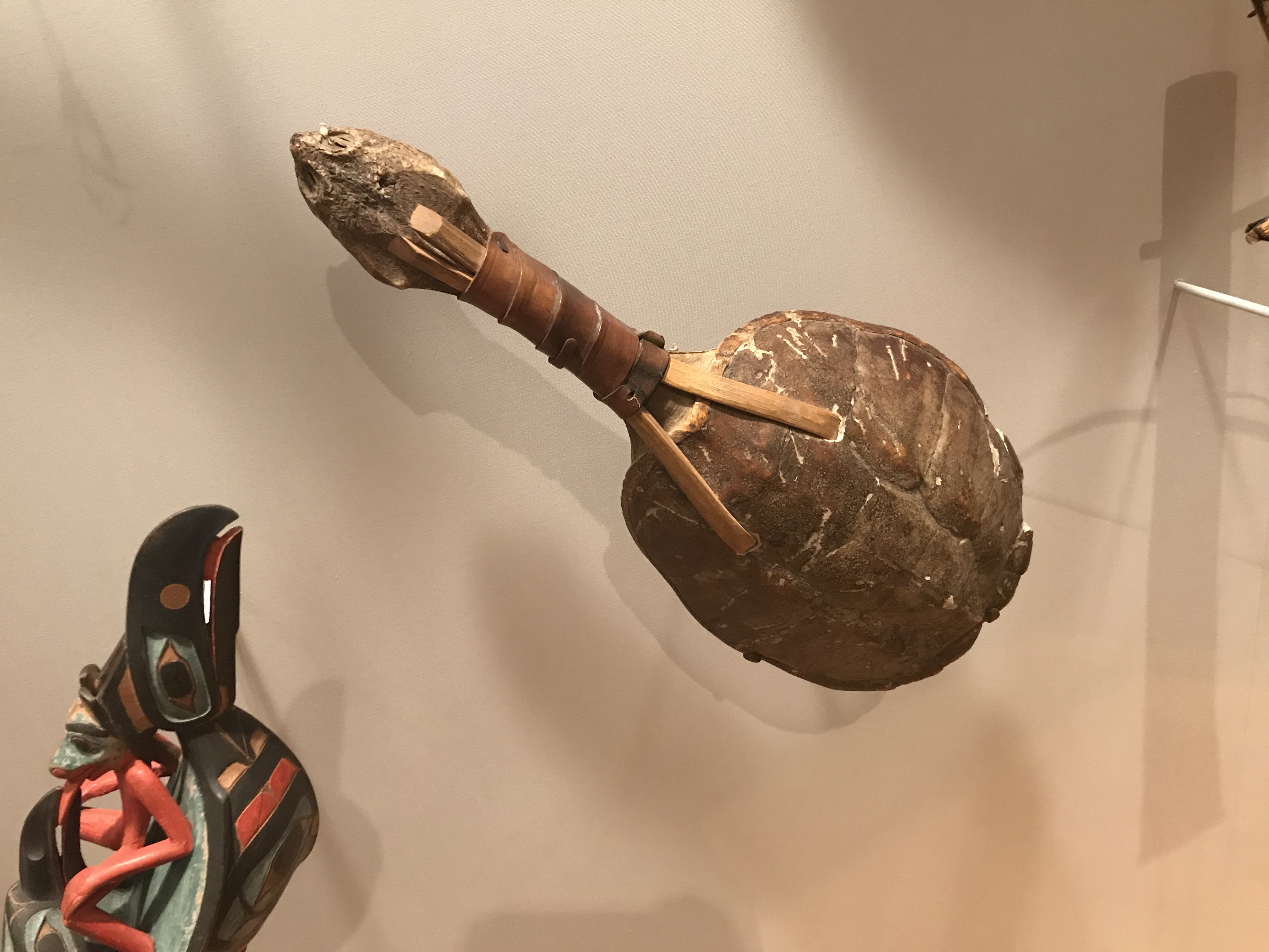 The kanyahte ka'nowa is a Seneca instrument made (obviously) from the shell of a snapping turtle, fastened together with wood and leather, and filled with cherry pits. Both the Seneca and Iroquois used these instruments in dance and healing rituals.