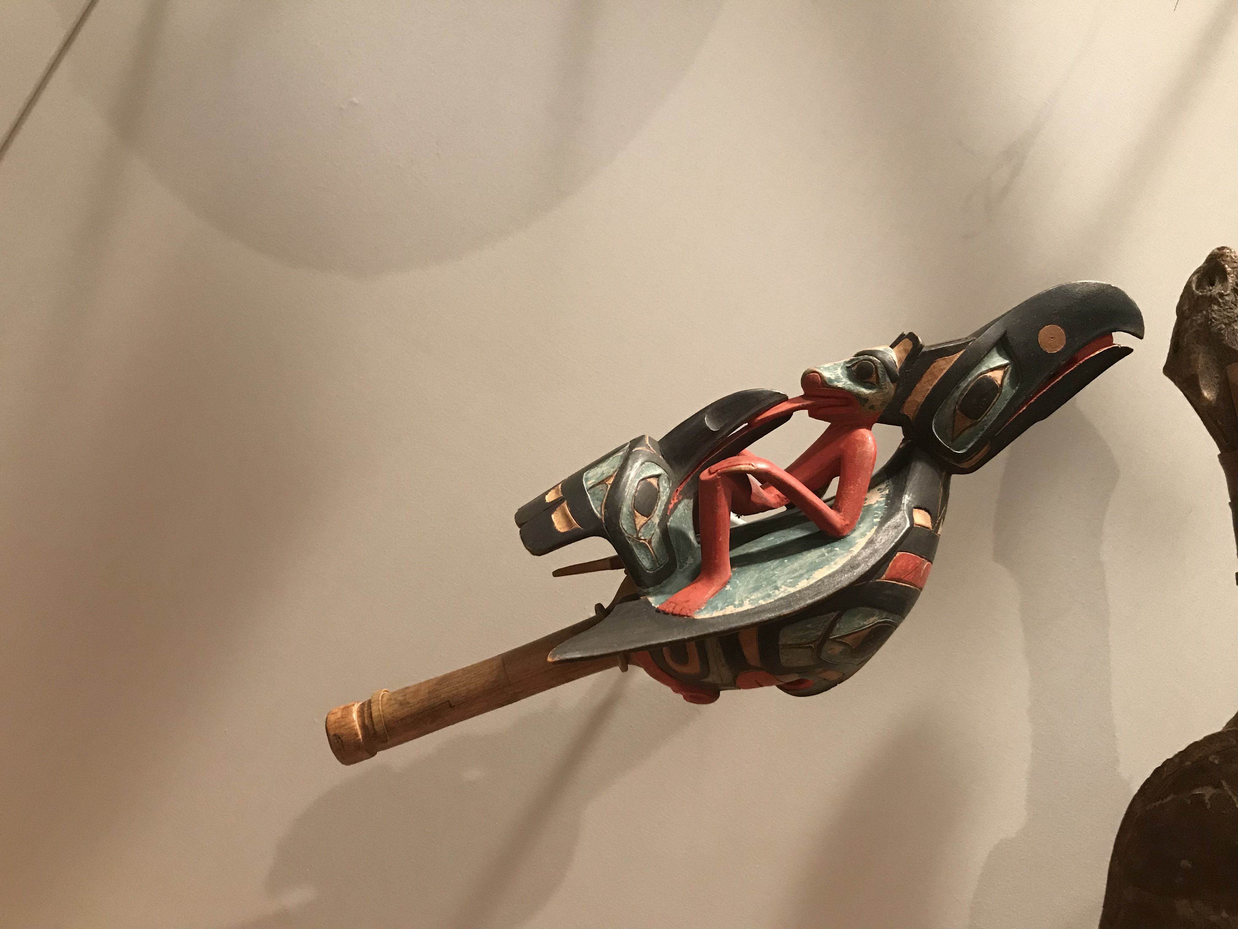 This elaborately decorated rattle is made by the Tsimshian people of western Canada. It is filled with seeds or small stones and was traditionally used for shamanic healing rituals.