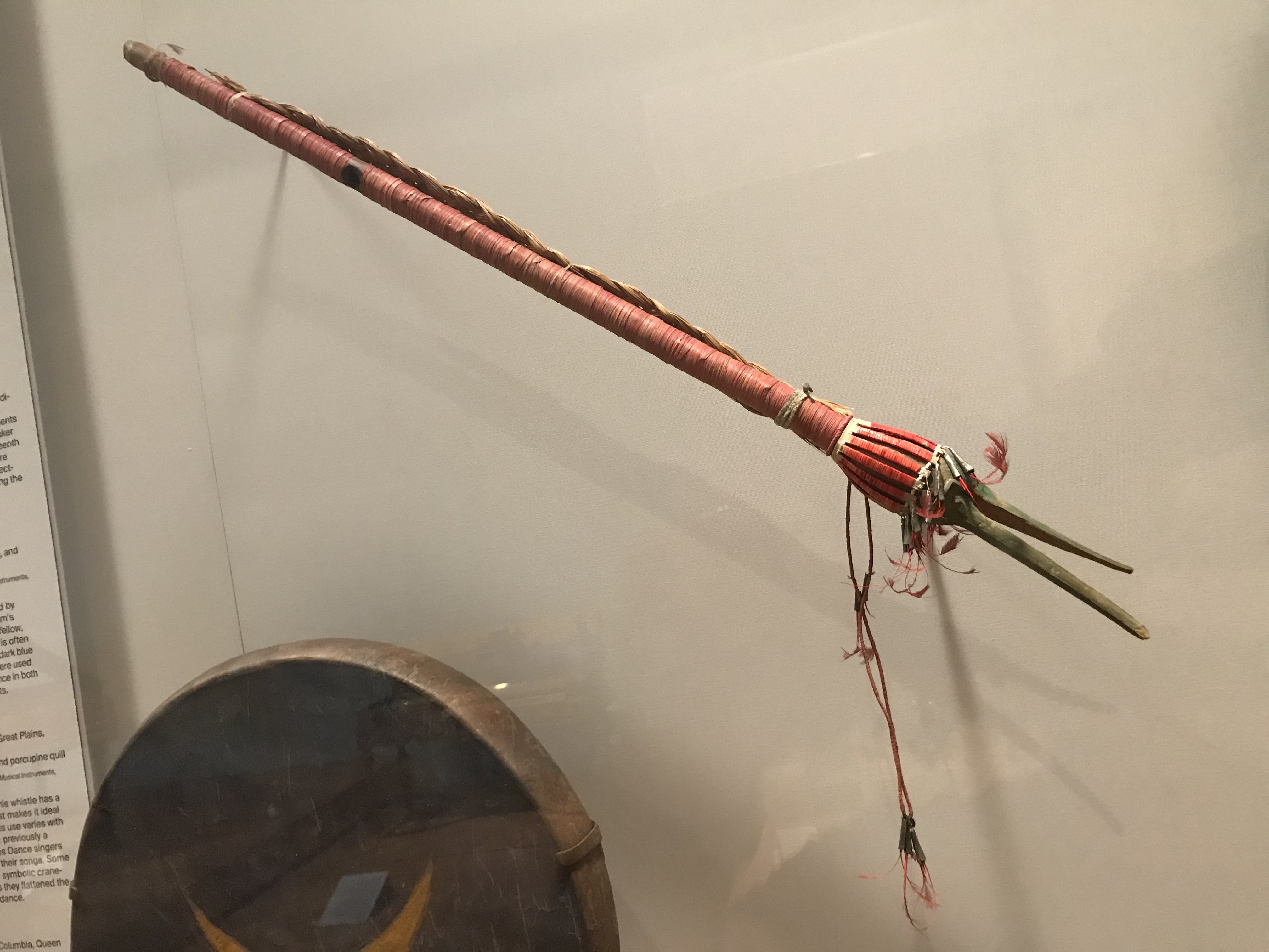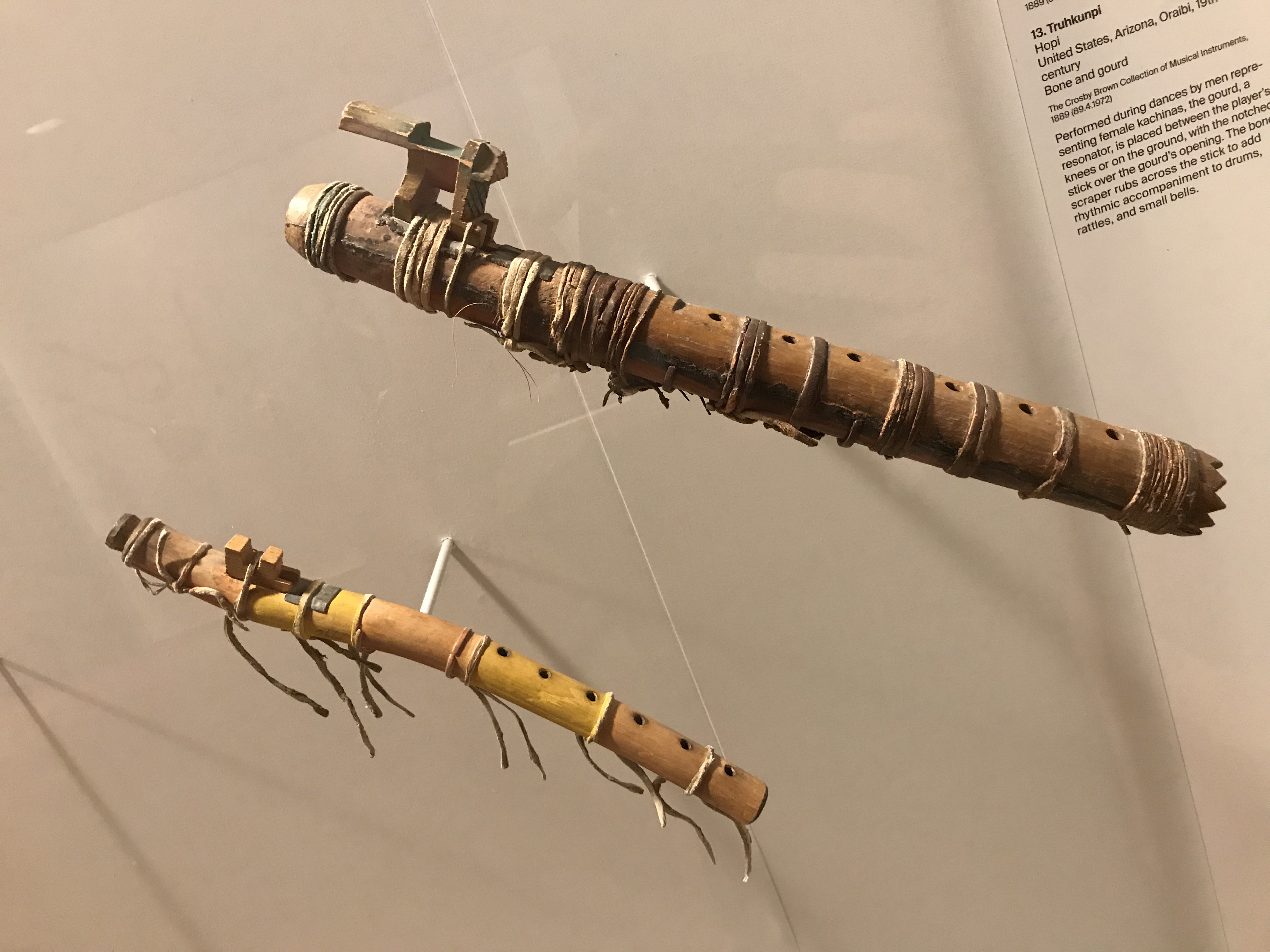 The sul is an Apache flute made from yucca wood and tanned leather. The larger siyontanka is similarly constructed and was made by the Chippewa, a Great Lakes tribe often in conflict with the Iroquois.