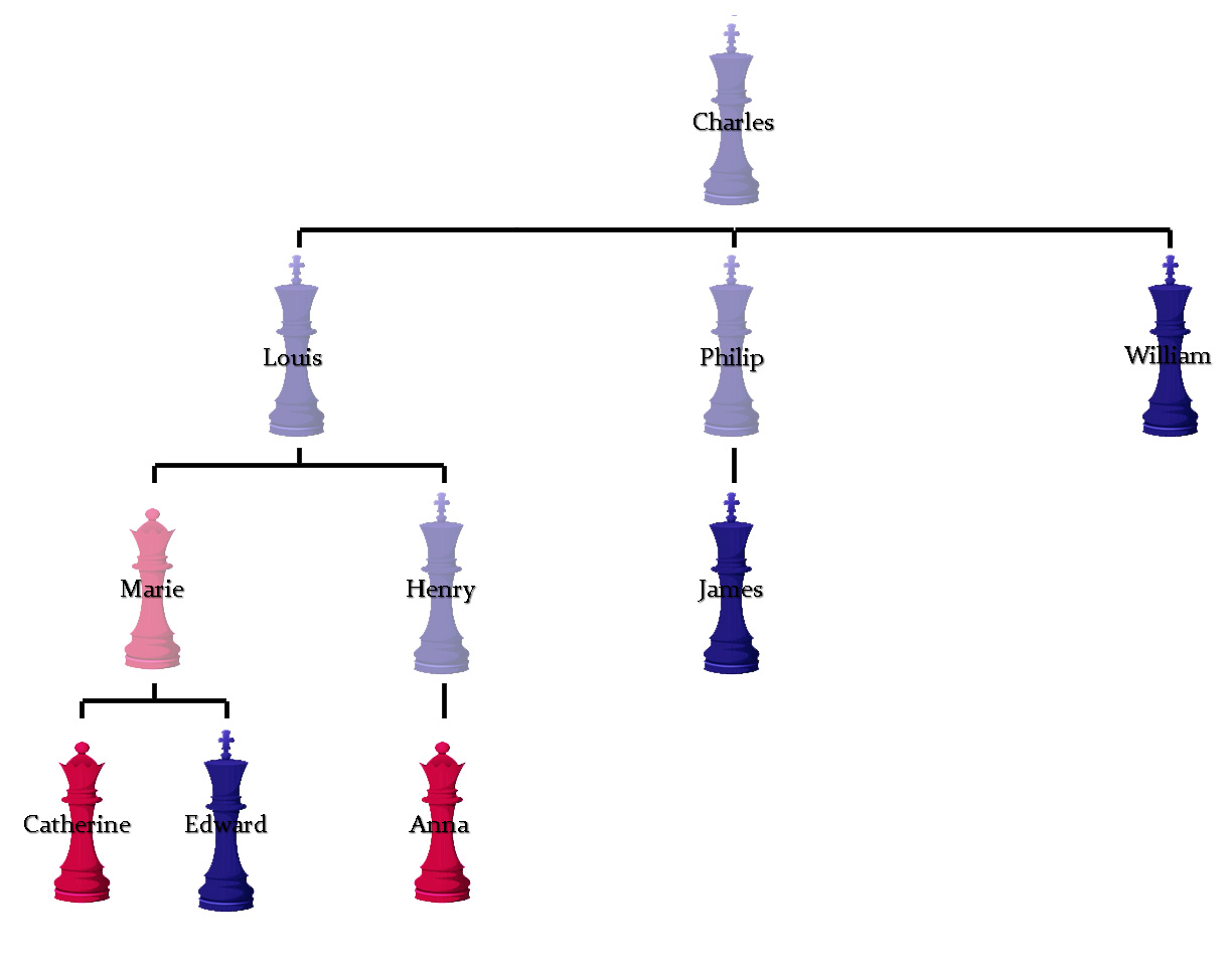 This may seem very obscure, but it is extremely important in a hereditary monarchy. A contested throne often results in war. In the fictional example chart below, each system of succession will result in a different monarch: