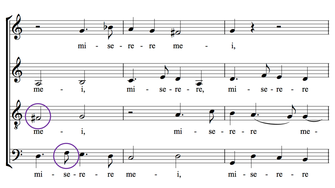 In this excerpt from William Byrd's "Miserere Mei," a false relation takes place between the tenor's F♯ and bass's F♮. Another false relation takes place at the end of each phrase in "Coventry Carol," a traditional English hymn for the Feast of the Innocents.